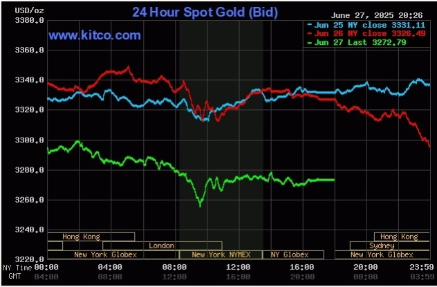 Chốt phiên giao dịch ngày 27/6, giá vàng thế giới giao ngay giảm 53 USD xuống 3.272 USD một ounce. Đây là mức thấp nhất một tháng. Tổng cộng cả tuần, giá đă giảm 2,8%, ghi nhận tuần thứ hai liên tiếp đi xuống.