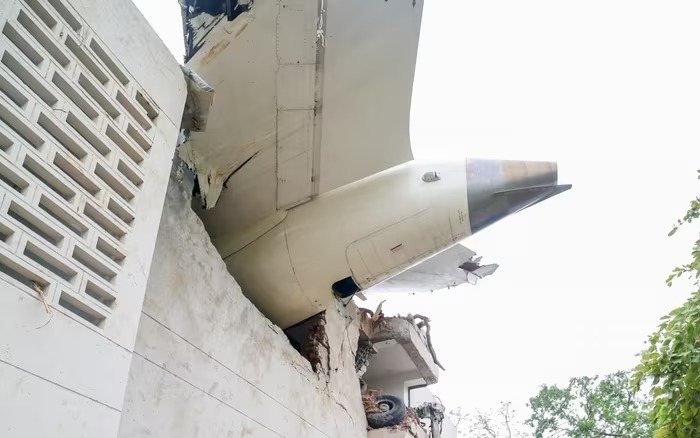 Đuôi máy bay hãng Air India cắm vào ký túc xá. Ảnh: ANI.