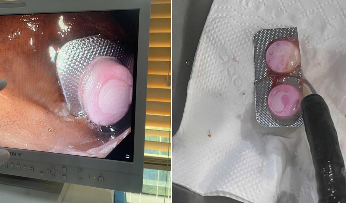 Bệnh nhân nhập viện với triệu chứng đau bụng dữ dội. Sau khi nội soi bác sĩ phát hiện 2 viên thuốc còn nguyên vỏ với 2 góc nhọn đâm thủng dạ dày gây nhiễm trùng.