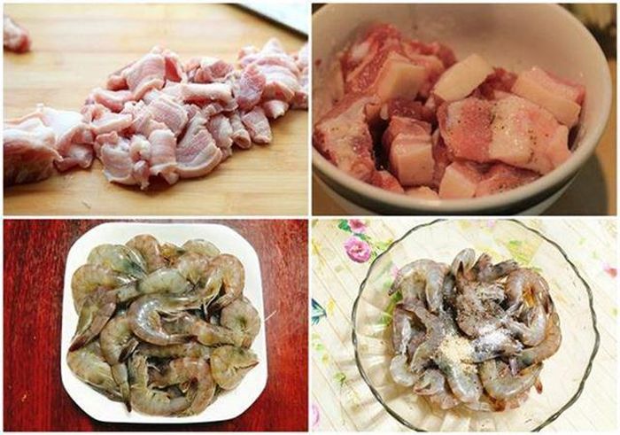 - Thịt ba chỉ rửa sạch, thái mỏng hoặc con chì tùy thích. Tôm cắt râu, rút chỉ đen, để ráo nước.