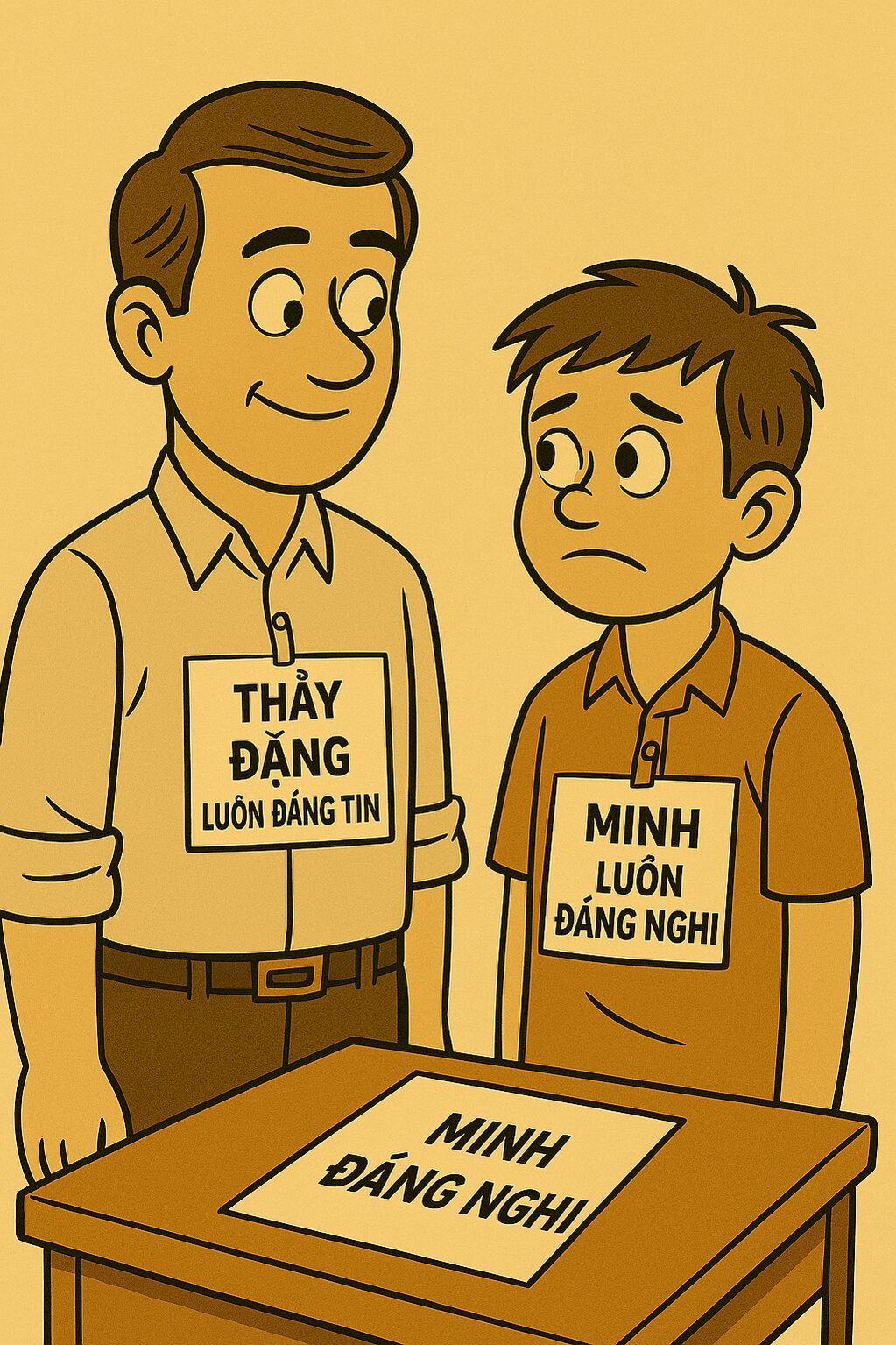 Sáng hôm sau, Minh mang theo bảng tên y hệt thầy, nhưng sửa lại một chút: “Minh – luôn đáng nghi”