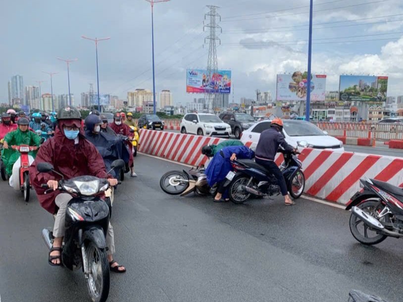 Cơn mưa trút xuống đoạn cầu Sài Gòn khiến mặt đường trơn, hàng chục người và xe máy té ngã.