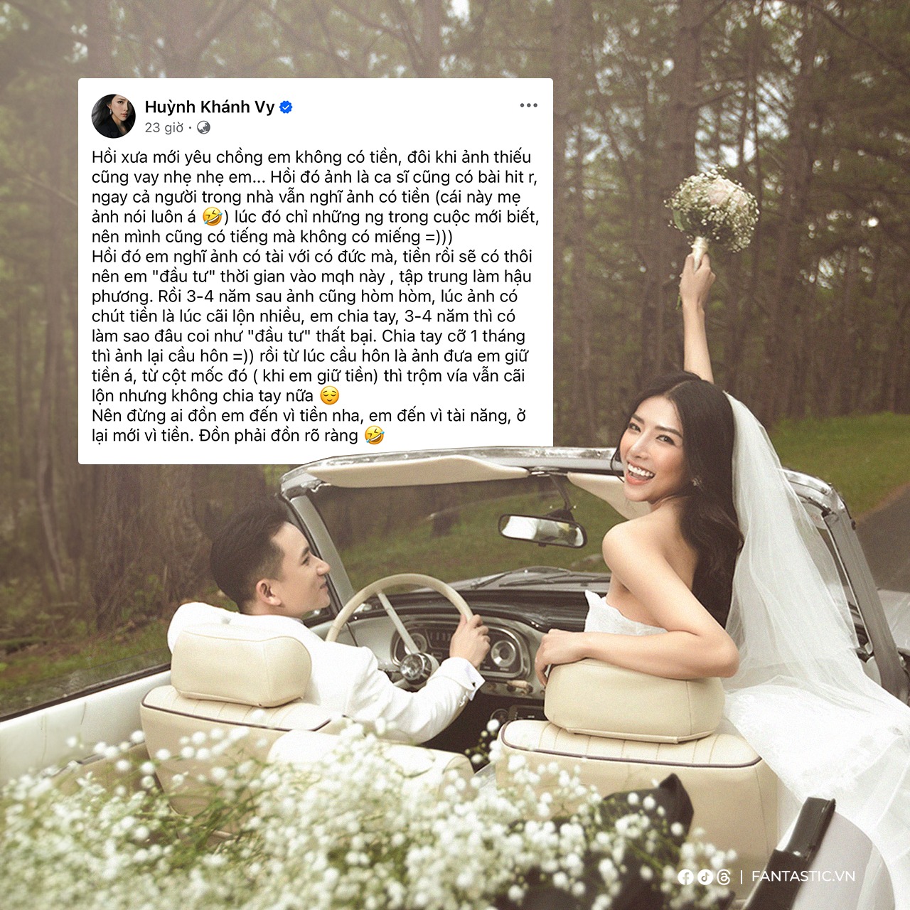 "Hồi xưa mới yêu chồng em không có tiền, đôi khi ảnh thiếu cũng vay nhẹ nhẹ em… Hồi đó ảnh là ca sĩ cũng có bài hit rồi. Ngay cả người trong nhà cũng nghĩ anh ấy có tiền nhưng chỉ người trong cuộc mới biết nên tôi có tiếng mà không có miếng", Huỳnh Khánh Vy kể.