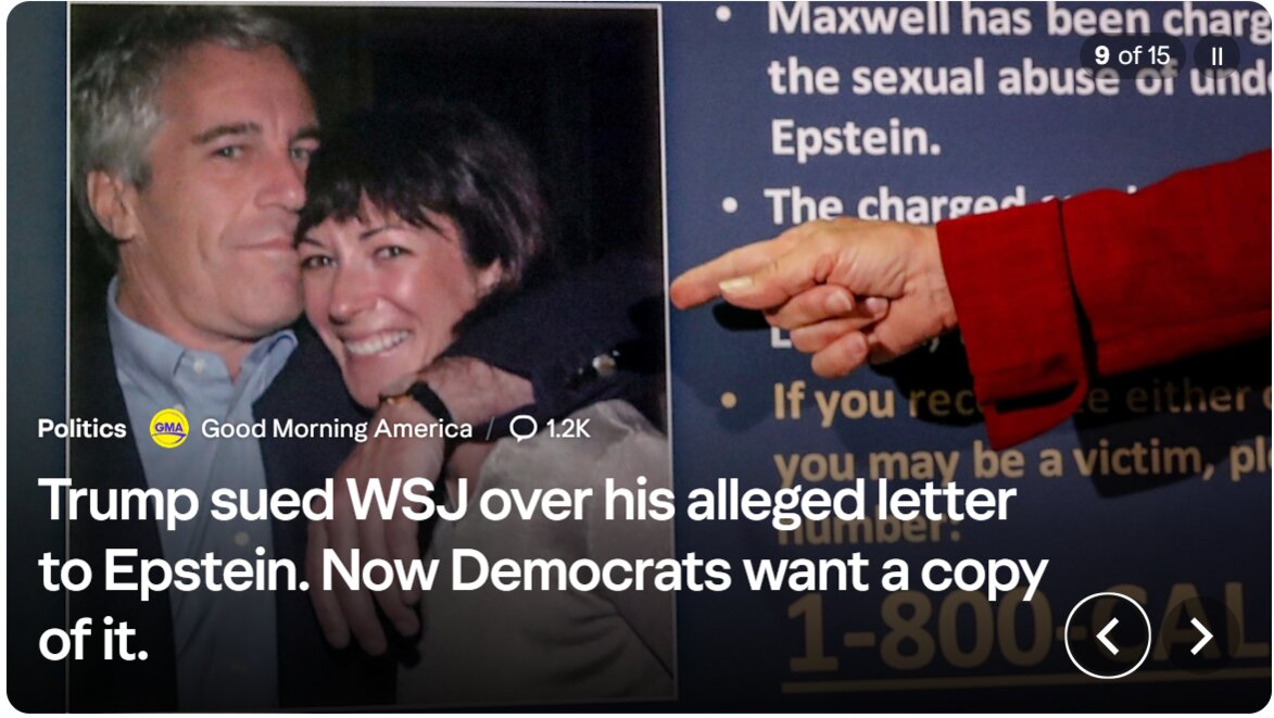 Theo một bài báo trên tờ Wall Street Journal, Trump bị cáo buộc đã gửi cho Epstein một lá thư vào năm 2003 nhân dịp sinh nhật lần thứ 50 của ông, lá thư này được trích dẫn trong một cuốn sách chứa đựng những lá thư từ nhiều cộng sự của Epstein.