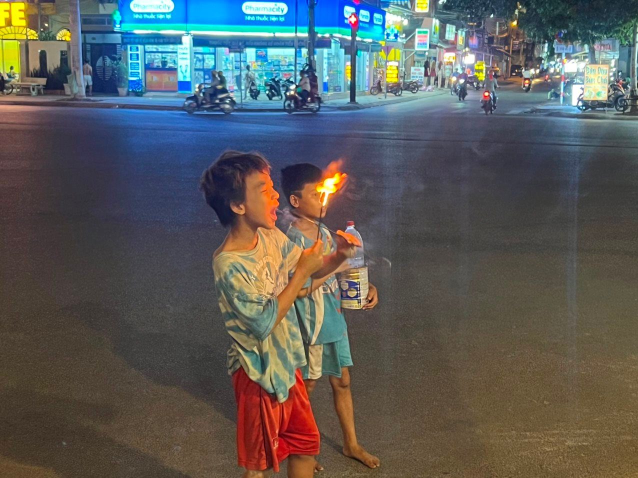 Em uống từng hớp dầu hỏa vào miệng, rất nhanh châm lửa bằng que mồi, đưa lên cao, rồi ngửa cổ phun dầu theo hướng lửa, tạo thành vệt cầu vồng đỏ rực. Động tác em thuần thục như một nghệ sĩ nhí biễu diễn, với đường phố là sân khấu. Và đó cũng là sân khấu của đời em, nhưng do không bán vé, nên khán giả cũng hững hờ.