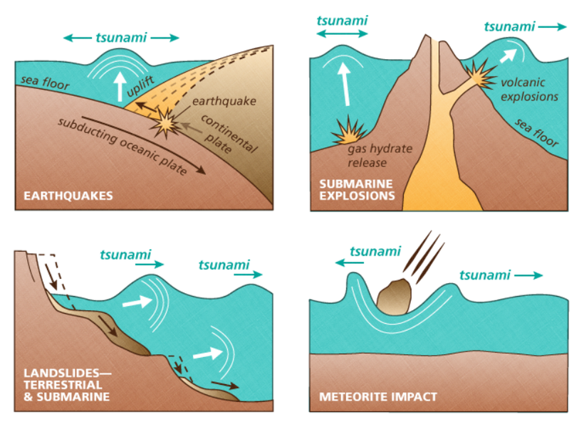 Động đất, sạt lở đất, hoạt động núi lửa và thiên thạch...đều có thể gây ra sóng thần. Ảnh: NOAA.
