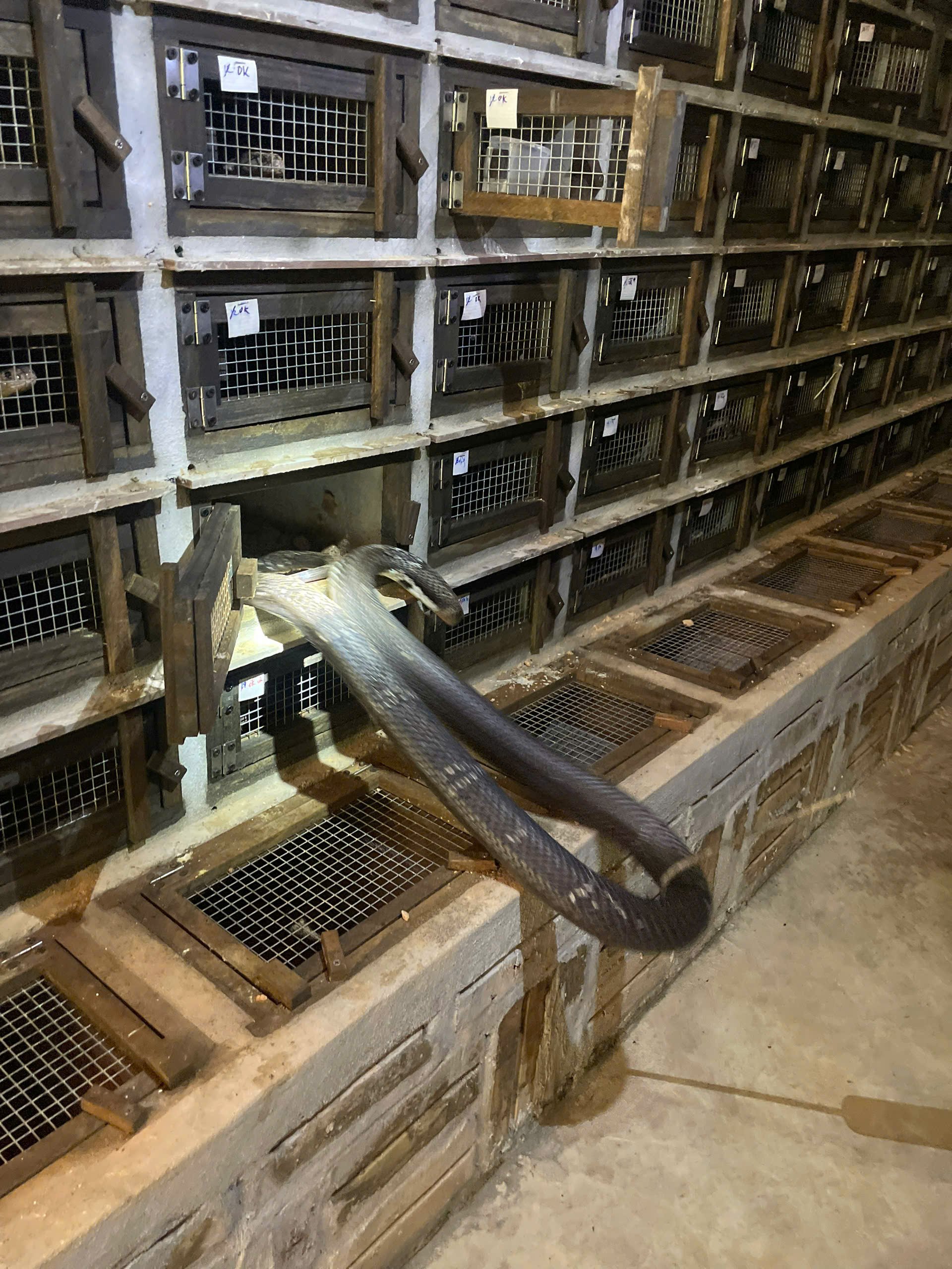 Hệ thống chuồng rắn hổ mang được anh Tùng thiết kế kiểu chuồng tầng, gồm 2 dãy chuồng xây bằng gạch, chia thành các ô riêng biệt.