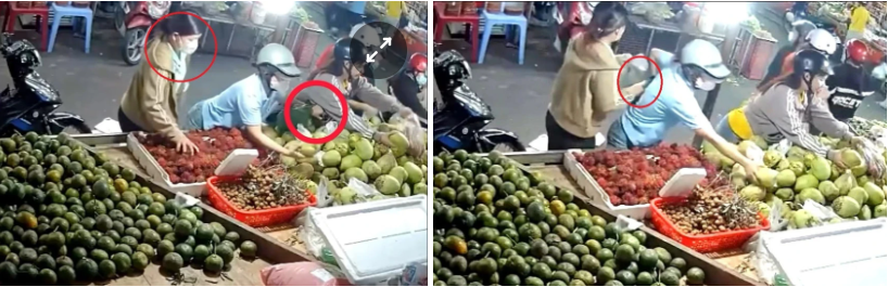 Hai người phụ nữ giả vớ lựa trái cây rồi trộm ví tiền của người bên cạnh. Người phụ nữ ở giữa sau khi lấy được chiếc ví đã chuyền qua tay người phụ nữ bên cạnh rồi nhanh chóng rời đi