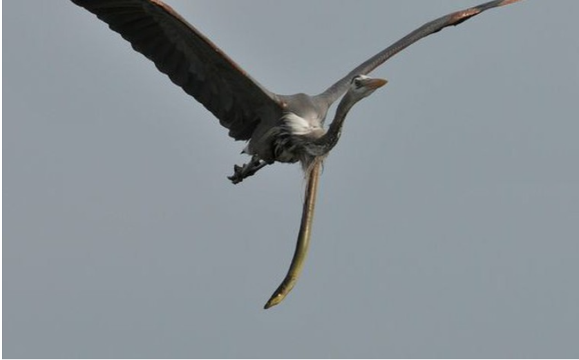 Con diệc đã nuốt chửng con lươn, nhưng chính con mồi ấy lại "phản đòn" một cách không tưởng: chui thẳng ra khỏi dạ dày chim, treo lủng lẳng giữa không trung!