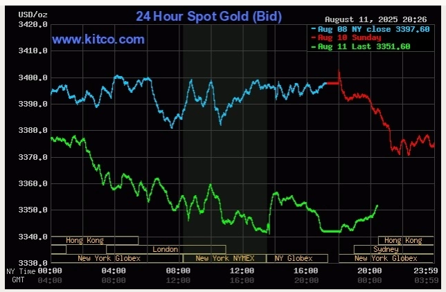Chốt phiên giao dịch 11/8, giá vàng thế giới giao ngay giảm 55 USD, về 3.341 USD một ounce. Thị trường đi xuống sau khi Tổng thống Mỹ Donald Trump thông báo trên mạng xã hội Truth Social rằng nước này "không áp thuế nhập khẩu vàng". Sang phiên sáng 12/8, giá hiện nhích lên 3.351 USD.