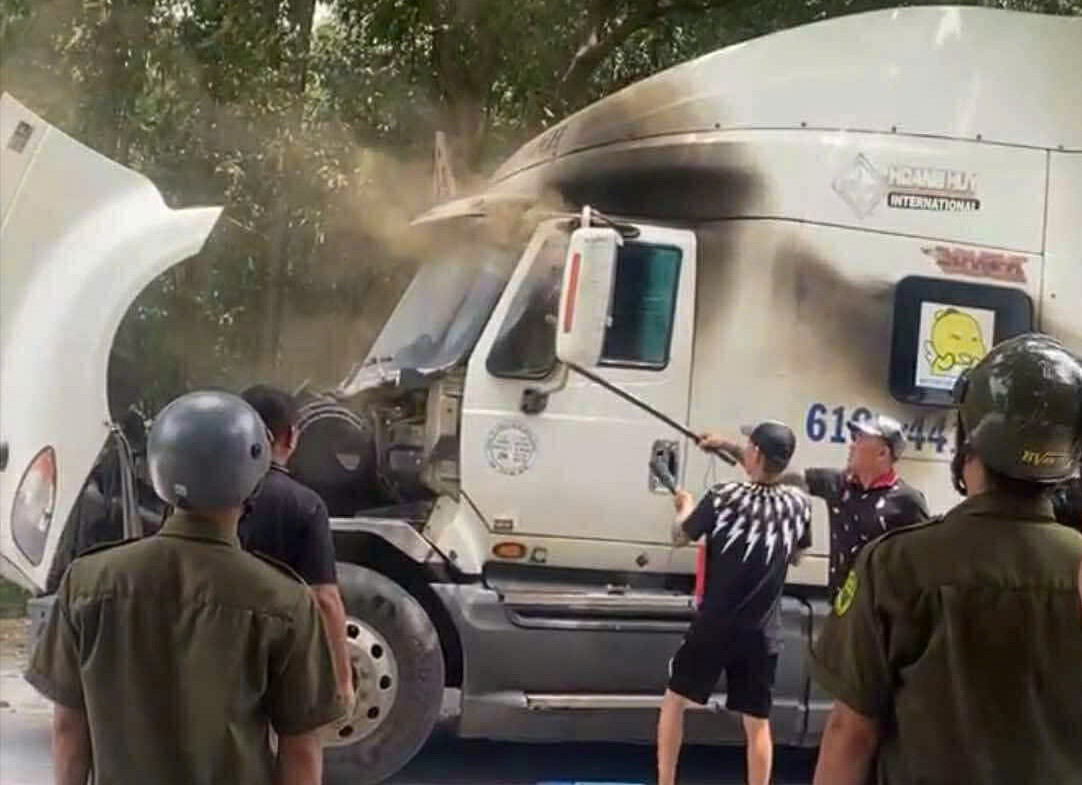 Người dân cùng lực lượng chức năng dập lửa bốc cháy từ cabin xe đầu kéo. Ảnh: T.T