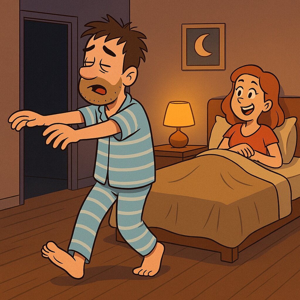 Nửa đêm, anh chồng lững thững bước ra khỏi phòng ngủ, mắt lim dim, tay khua khua như người mộng du. Cô vợ nằm trên giường, hé mắt nhìn, giọng bình thản: – Này anh, khỏi phải giả làm kẻ mộng du nữa. Tôi đuổi cô giúp việc từ sáng rồi.