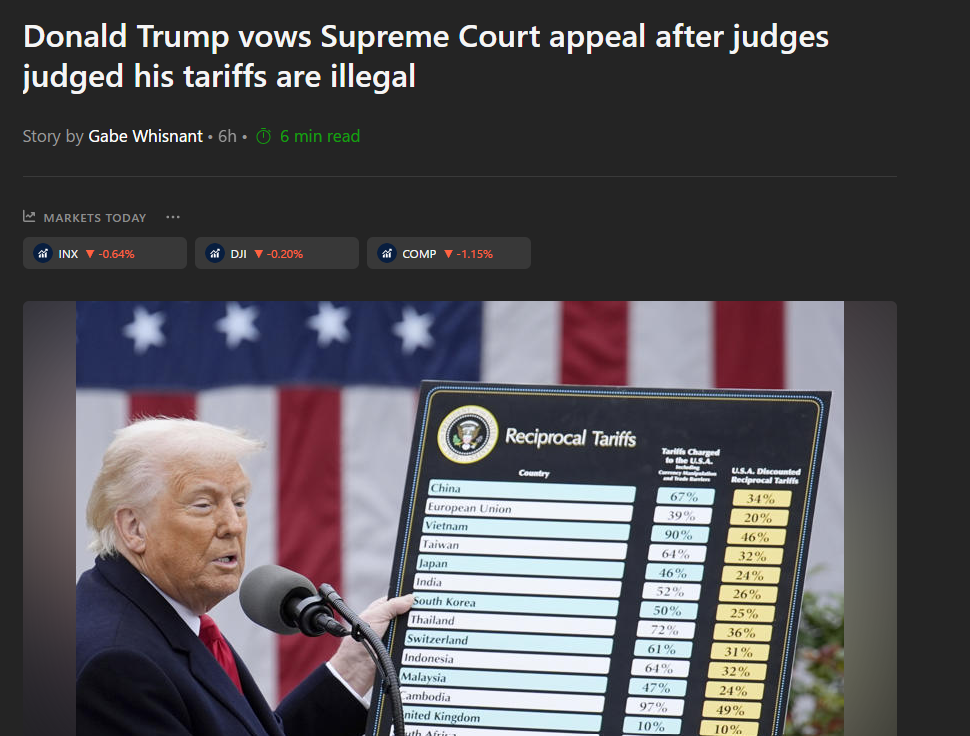 Trump đă báo hiệu sẽ kháng cáo lên Ṭa án Tối cao trong một bài đăng trên Truth Social sau phán quyết, một phần nói rằng, "TẤT CẢ CÁC BIỂU THUẾ QUAN VẪN C̉N HIỆU LỰC! Hôm nay, một Ṭa Phúc thẩm cực kỳ thiên vị đảng phái đă sai lầm khi tuyên bố rằng Thuế quan của chúng ta sẽ bị xóa bỏ, nhưng họ biết rằng cuối cùng Hoa Kỳ sẽ thắng. Quốc gia.