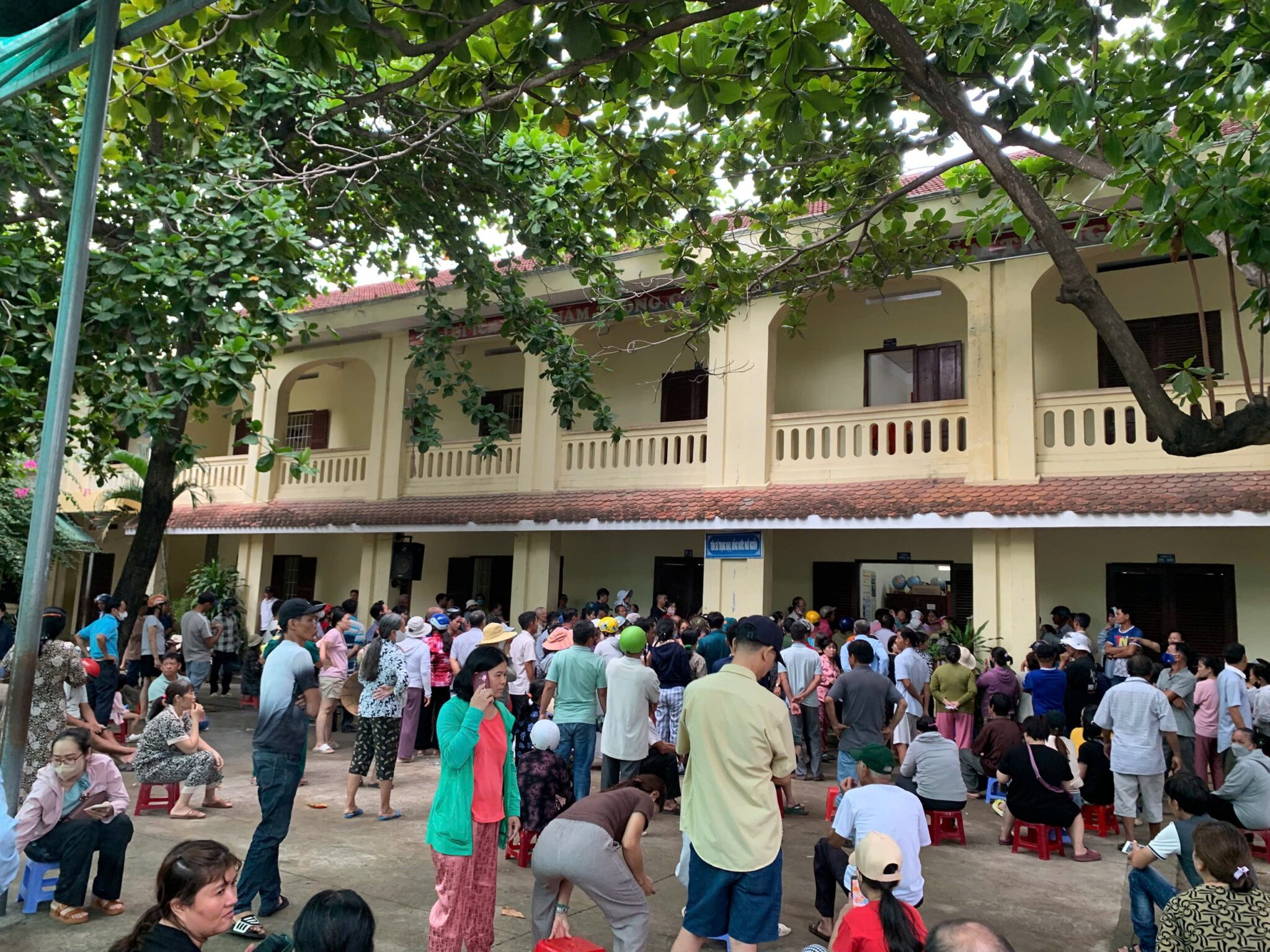 Người dân đứng ngồi tại trụ sở phường Nam Nha Trang, để chờ nhận 100,000 đồng. (Ảnh: Người Lao Động)