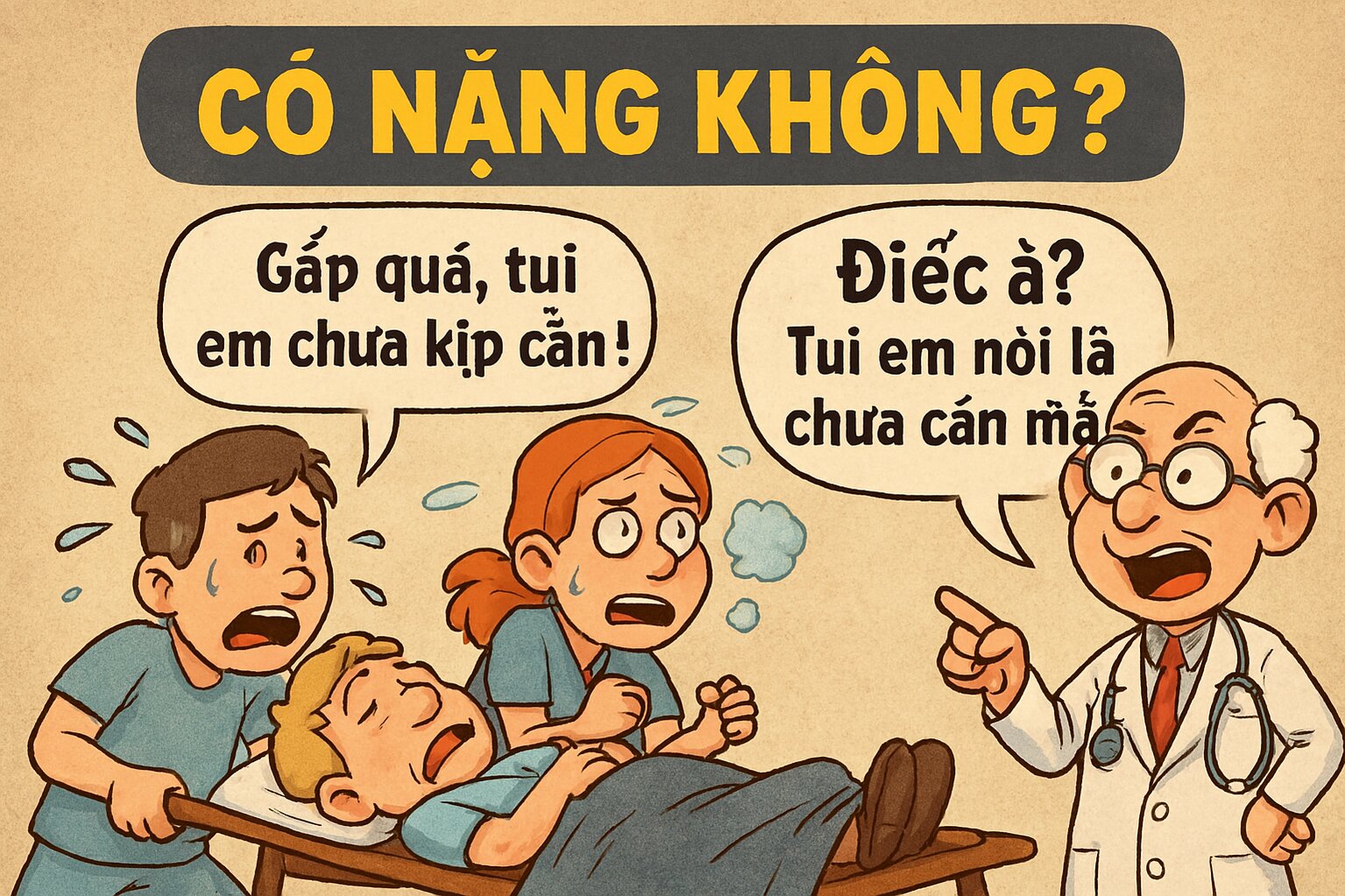 Tại pḥng cấp cứu, hai y tá hối hả khiêng một bệnh nhân vào. Bác sĩ trực thấy vậy liền hỏi: – Có nặng không?