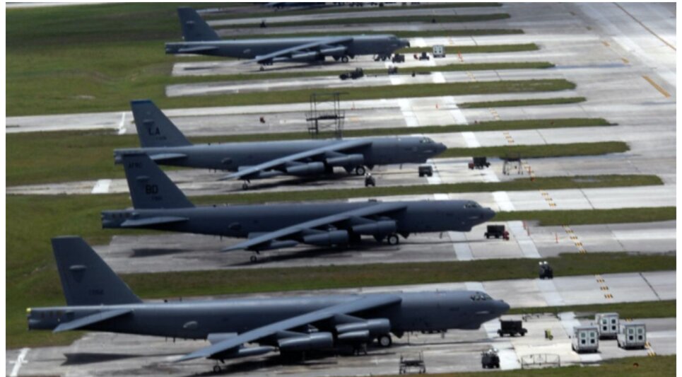 Máy bay ném bom chiến lược B-52H có khả năng mang vũ khí hạt nhân của Không quân Mỹ trên đảo Guam. Ảnh: MW.