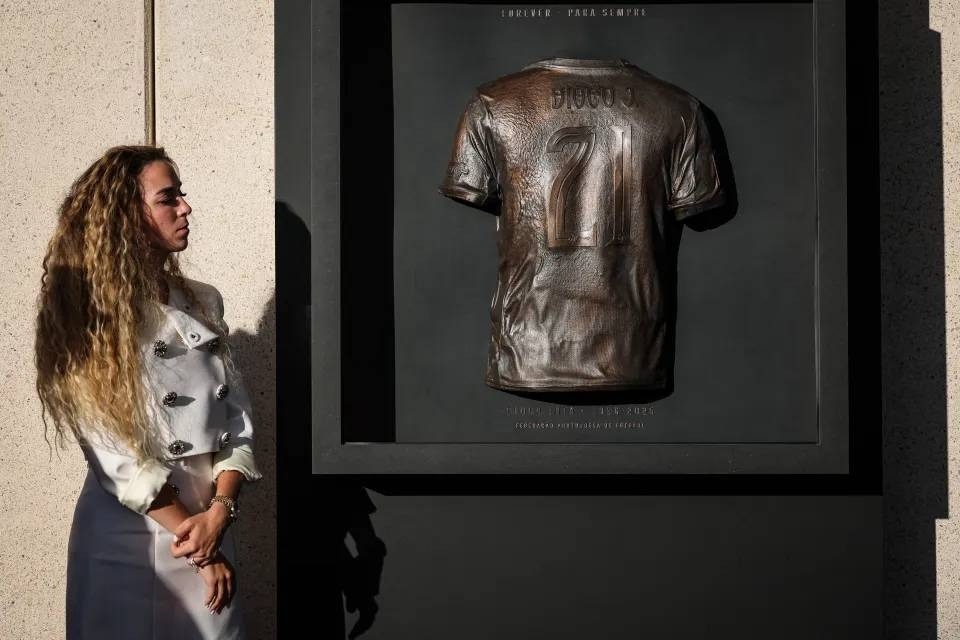 Bà quả phụ Rute Cardoso khánh thành tượng đồng áo số 21 của người chồng vừa qua đời. Ảnh: AFP