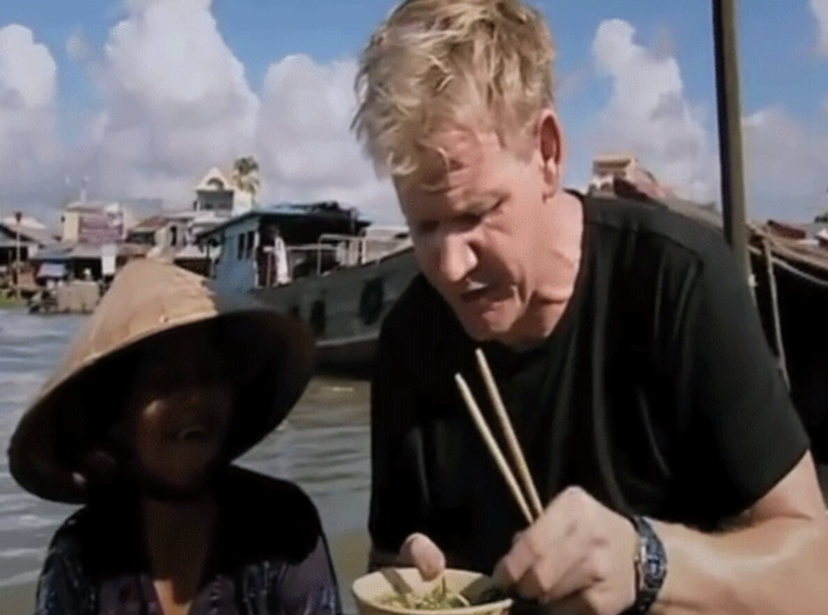 Tại đây, ông đã thưởng thức một bát hủ tiếu dân dã do một người phụ nữ nấu trên ghe. Chỉ với hương thơm phảng phất của hẹ, rau mùi, húng quế hòa quyện trong nước lèo, món hủ tiếu đã khiến Ramsay vô cùng ngạc nhiên.
