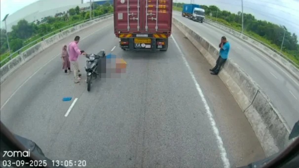 Đúng lúc này, bánh sau của chiếc container phía trước cán qua người vợ, khiến nạn nhân tử vong tại chỗ. Người chồng và con gái chỉ bị thương nhẹ, nhưng cú sốc tâm lý để lại quá lớn. Cảnh quay từ camera hành trình của một ô tô phía sau đã ghi lại toàn bộ diễn biến, hiện đang lan truyền mạnh mẽ trên mạng xã hội Malaysia.