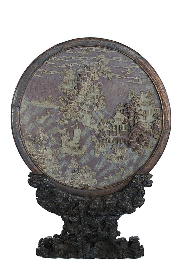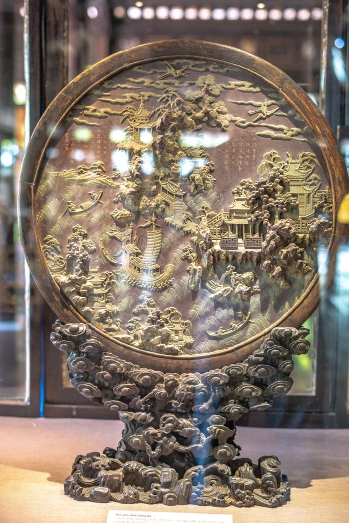 Cổ vật này là một kiệt phẩm về nghệ thuật chạm trổ đá quý. Với những mảng chạm lồi lõm, chi li, tỷ mẫn, cách bố cục không gian đầy sáng tạo, nghệ nhân xưa đã tạo nên một bức tranh tuyệt đẹp với đầy đủ đình tạ, lầu các, cầu cống, non bộ, cổ thụ, mây trời, mặt nước, con thuyền, chim muông… Khung cảnh tựa như ở chốn Bồng Lai tiên cảnh, hoặc như trong vườn thượng uyển mơ ước của hoàng cung.
