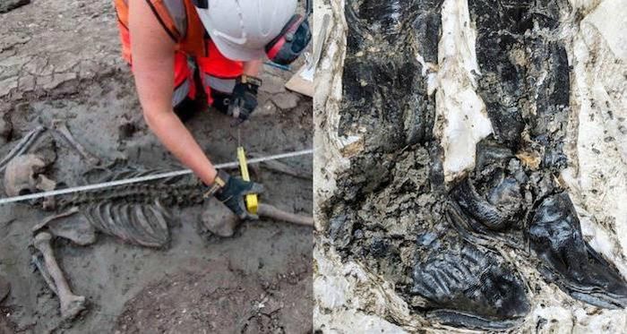 Các nhà khảo cổ tìm thấy bộ hài cốt nam giới khoảng 500 tuổi trong tư thế úp mặt xuống bùn bên bờ sông Thames, London, Anh khi thực hiện dự án "siêu cống" mới. Dự án có kinh phí 5,4 tỷ USD nhằm mục đích thu gom, lưu trữ và vận chuyển nước thải thô và nước mưa hiện đang tràn vào sông. Ảnh: MOLA Headland Infrastructure.