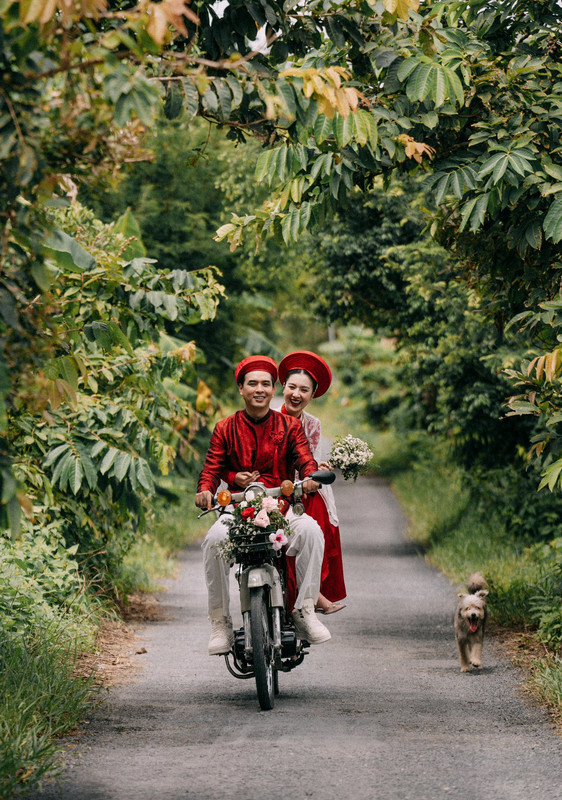 Thay vì dùng xe sang, Hồ Quang Hiếu lựa chọn xe máy để rước nàng về dinh, hình ảnh mộc mạc, gần gũi này của cặp đôi khiến dân mạng thích thú