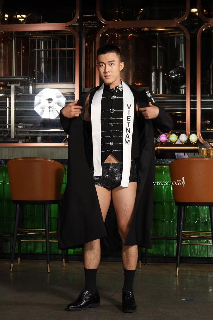 Ở phần thi thời trang, người mẫu nam diện outfit với choàng tối màu kết hợp bên trong là nội y. Trong khi đó, dàn thí sinh đến từ các quốc gia khác lịch lãm với vest hoặc suit.