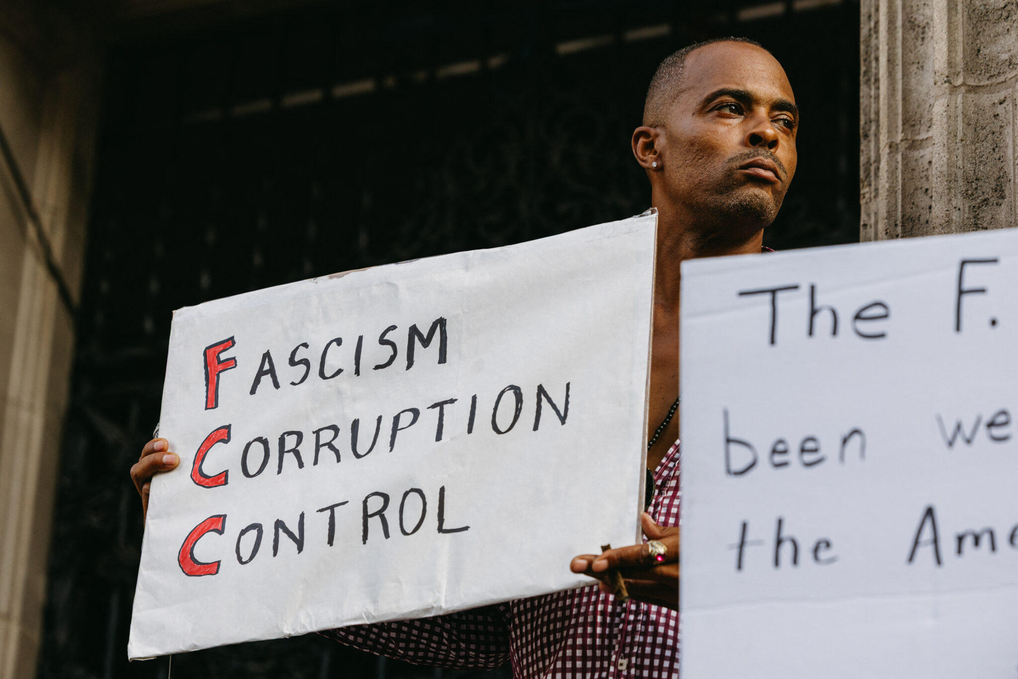 Một người biểu tình đang giương bảng "FCC: Fascism Corruption Control" (FCC, tên viết tắt của Ủy Ban Truyền Thông Liên Bang, nghĩa là "phát xít", "tham nhũng", "kiểm soát") bên ngoài hý viện El Capitan Theatre trên đại lộ Hollywood Boulevard ở Hollywood, California, hôm 18/9/2025. (Minh họa)