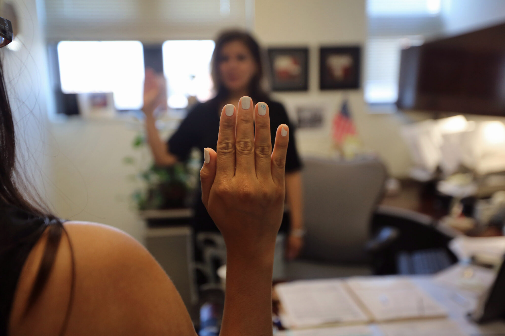 Một người đi thi quốc tịch đang tuyên thệ, nói sự thật trước khi thi tại văn phòng Sở Di Trú Và Nhập Tịch Hoa Kỳ (USCIS). (Ảnh minh họa: John Moore/Getty Images)