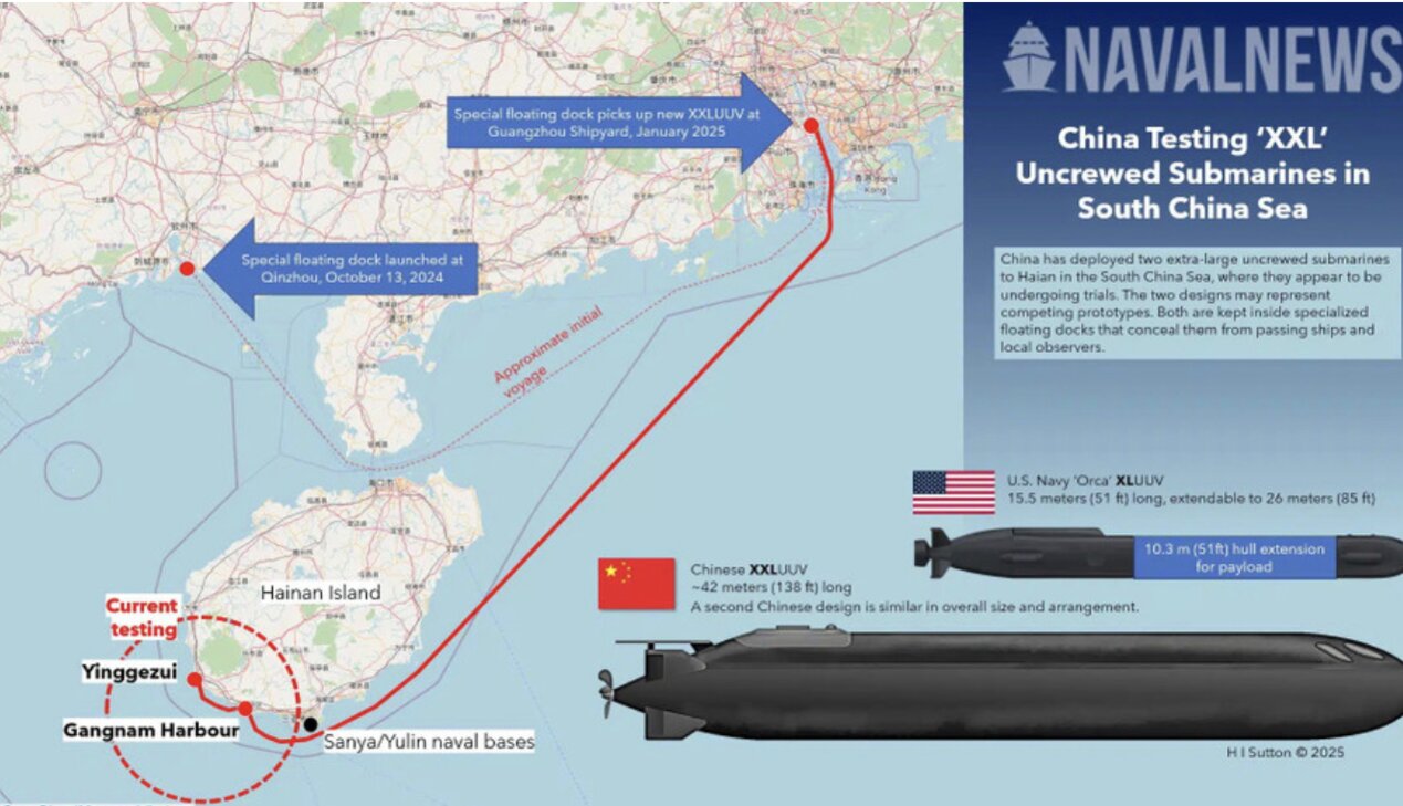 Trung Quốc cũng được tiết lộ đã chế tạo hai tàu ngầm không người lái như vậy và đang thử nghiệm đồng thời ở Biển Đông. Cả hai đều được đánh giá tại các khu vực quanh đảo Hải Nam và hiện đang tạm thời đóng quân tại cảng Cam Môn, phía Tây căn cứ hải quân chính ở Tam Á.