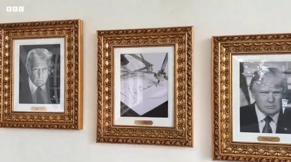 Đáng chú ý là chân dung của cựu Tổng thống Joe Biden đã bị thay thế bằng hình ảnh một chiếc bút tự động ký tên ông.