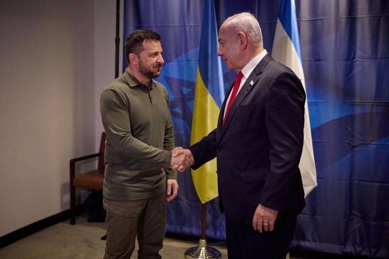 Tổng thống Ukraine Volodymyr Zelensky (trái) bắt tay Thủ tướng Israel Benyamin Netanyahu trong cuộc gặp bên lề kỳ họp thứ 78 của Đại hội đồng Liên hợp quốc tại New York, ngày 19 tháng 9 năm 2023. Ảnh Thearabweekly