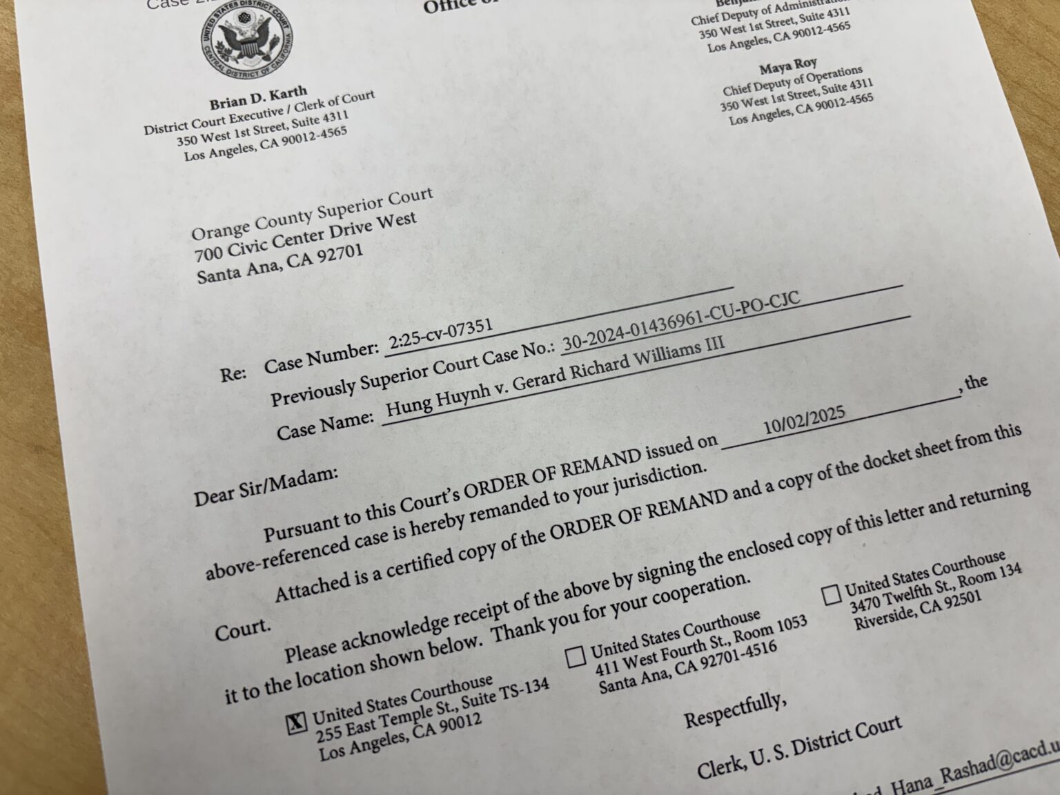 Trong thông báo gởi cho Tòa Thượng Thẩm California ở Orange County, Chánh Án Karth viết: “Thưa ông/bà, theo Phán Quyết Gởi Trả đưa ra ngày 2 Tháng Mười, 2025, trường hợp nêu trên được gởi trả về thẩm quyền tòa của quý vị. Kèm theo là một bản sao phán quyết và một bản sao hồ sơ của tòa. Xin xác nhận đã nhận hồ sơ này qua chữ ký trong bản sao của lá thư này và gửi trả lại theo địa chỉ ghi trong đó. Cảm ơn quý vị hợp tác.”