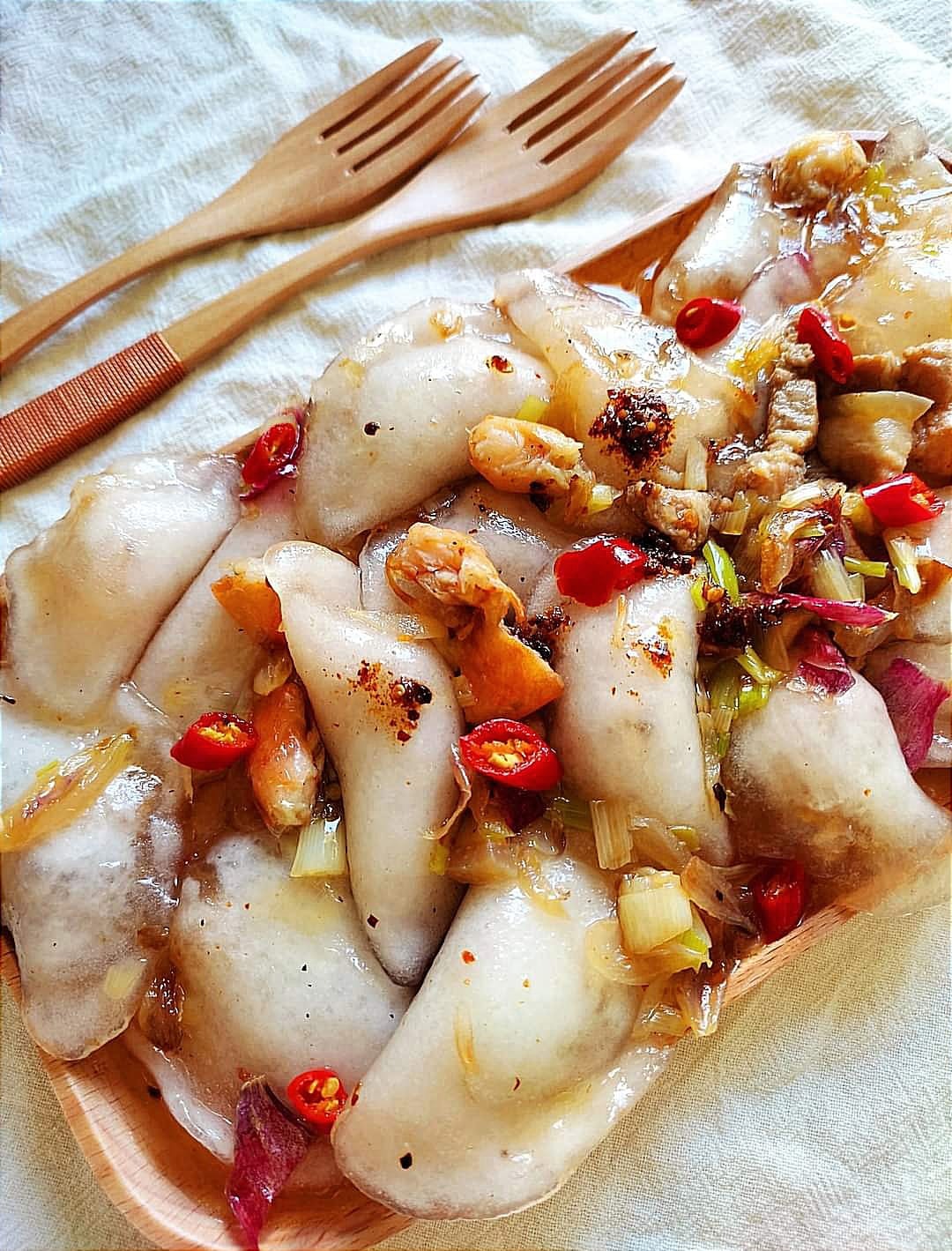 Đến lúc này, bạn có thể làm chén nước mắm ớt để chấm hoặc chiên bánh lọc trong dầu. Phi thơm hành phi, ớt trong chảo, nêm ít nước mắm, đường, chút nước nấu sôi rồi cho bánh lọc vào xào là hoàn thành.