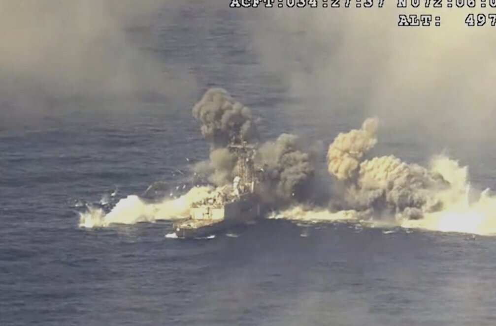 Tàu chiến bị đánh chìm có thể là tàu khu trục USS Simpson cũ của Hải quân Mỹ, được nhìn thấy đang được kéo ra khỏi Cơ sở bảo dưỡng tàu không hoạt động của Hải quân ở Philadelphia vào ngày 25/9.