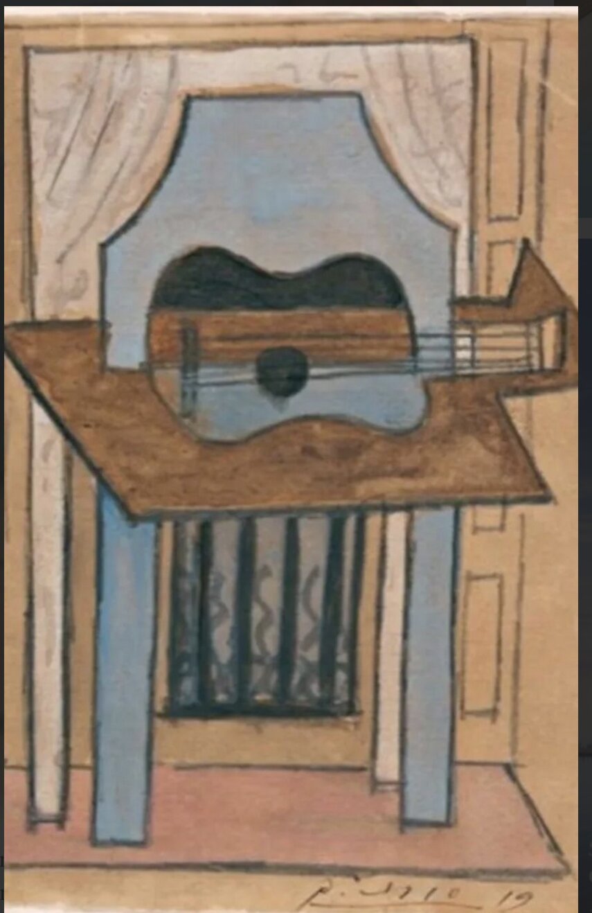 Bức gouache nhỏ mang tên “Still Life with Guitar” (Tĩnh vật với đàn guitar) được Picasso thực hiện năm 1919, có kích thước chỉ 12,7 x 9,8 cm, dự kiến được trưng bày từ ngày 9/10 tại CajaGranada Cultural Center, thành phố Granada, Tây Ban Nha.