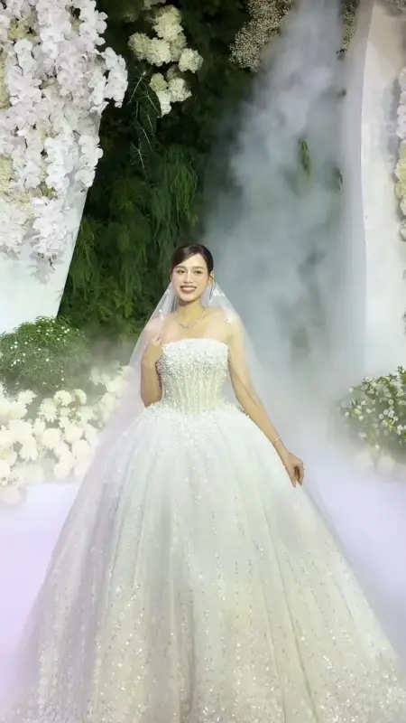 Mới đây, trên mạng xã hội, loạt khoảnh khắc Đỗ Thị Hà xuất hiện trong bộ váy cưới tại nhà trai đã được lan truyền rộng rãi. Người đẹp gốc Thanh Hóa lựa chọn mẫu váy cưới cúp ngực tinh tế, tôn lên bờ vai thon và làn da trắng mịn. Thiết kế phần thân dưới xòe rộng giúp tổng thể vừa mang vẻ sang trọng, vừa giữ được nét nhẹ nhàng, nữ tính.