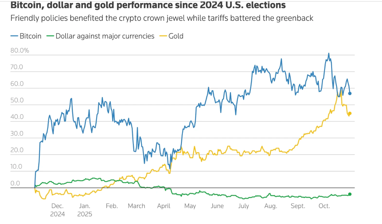 Hiệu suất của Bitcoin, đồng USD và vàng kể từ bầu cử Mỹ 2024. Biểu đồ: Reuters.