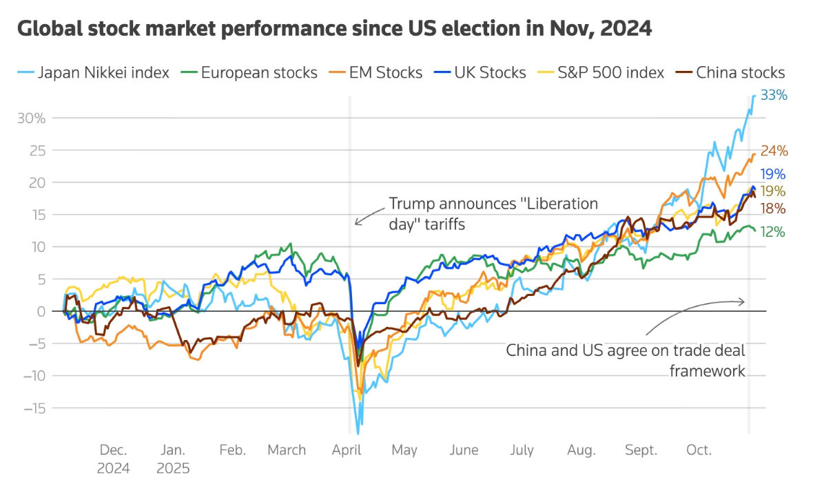 Hiệu suất thị trường chứng khoán toàn cầu kể từ cuộc bầu cử Mỹ tháng 11/2024. Ảnh: Reuters.