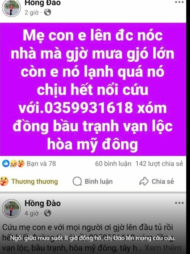 Trên mạng xã hội, những lời cầu cứu xé lòng liên tục được chia sẻ: “Ai cứu con trai em với. Không còn hy vọng cuối cùng sao mọi người...”, hay “Ba mẹ con ngồi khóc 8 tiếng trên nóc nhà chưa được cứu...”. Mỗi tin nhắn, mỗi đoạn ghi âm đều mang theo sự tuyệt vọng của những người đang cố bấu víu từng phút vào sự sống.