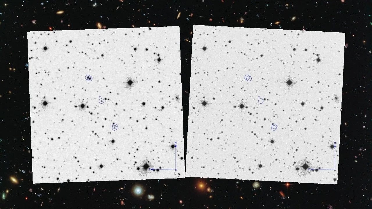 Một đêm năm 1952, năm vật thể thoáng qua (vòng tròn xanh) xuất hiện và biến mất trong vòng một giờ, theo các cuộc khảo sát bầu trời được lưu trữ. Các nhà khoa học đang tìm hiểu bí ẩn kéo dài hàng thập kỷ này. Nguồn ảnh: Villarroel và cộng sự/Ấn phẩm của Hiệp hội Thiên văn Thái Bình Dương/Kính viễn vọng Không gian Hubble.