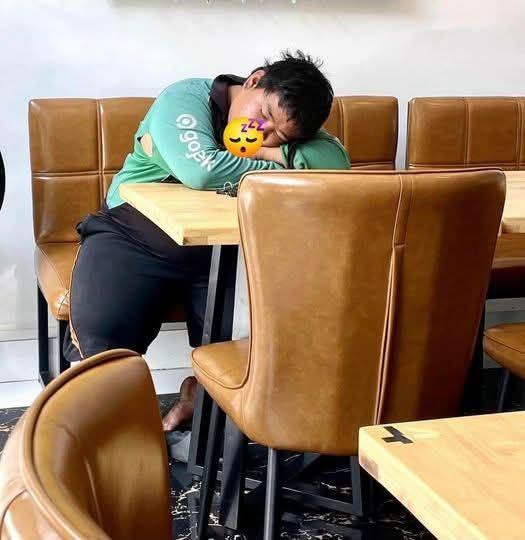 Chẳng ai thấy phiền khi thấy anh ấy ngủ, kể cả chủ và nhân viên của nhà h,à n,g, những vị khách bước vào, trên môi họ nở một nụ cười nhẹ khi nhìn thấy anh shipper ngủ say sưa… Tầm 10 phút sau, nhà h,à n,g chuẩn bị xong đơn và kêu anh shipper thức dậy, anh ấy bừng tỉnh và gãi đầu theo kiểu rất ái ngại… chắc anh ấy không nghĩ rằng mình đã ngủ khi đang chờ đơn.