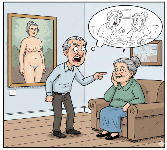 Có một ông nọ vào phòng triển lãm xem tranh. Bỗng ông giật mình vì thấy một bức tranh vẽ người đàn bà khỏa thân giống hệt vợ mình...