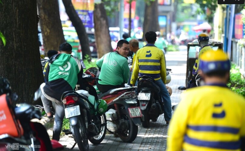 Tài xế xe công nghệ chờ khách trên đường tại trung tâm TP HCM, ngày 24/5. Ảnh: Thanh Tùng