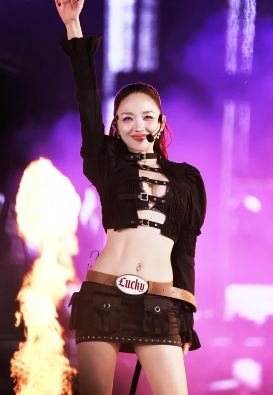 Với crop top đen tay dài điểm xuyết dây khóa trang trí, kết hợp chân váy mini và thắt lưng bản lớn, Tóc Tiên thể hiện rõ tinh thần cá tính pha chút nổi loạn. Thiết kế gọn gàng nhưng giàu điểm nhấn, phù hợp với những màn trình diễn sôi động, nơi cô luôn làm chủ không gian bằng thần thái tự tin và phong cách riêng biệt. Ảnh: FBNV
