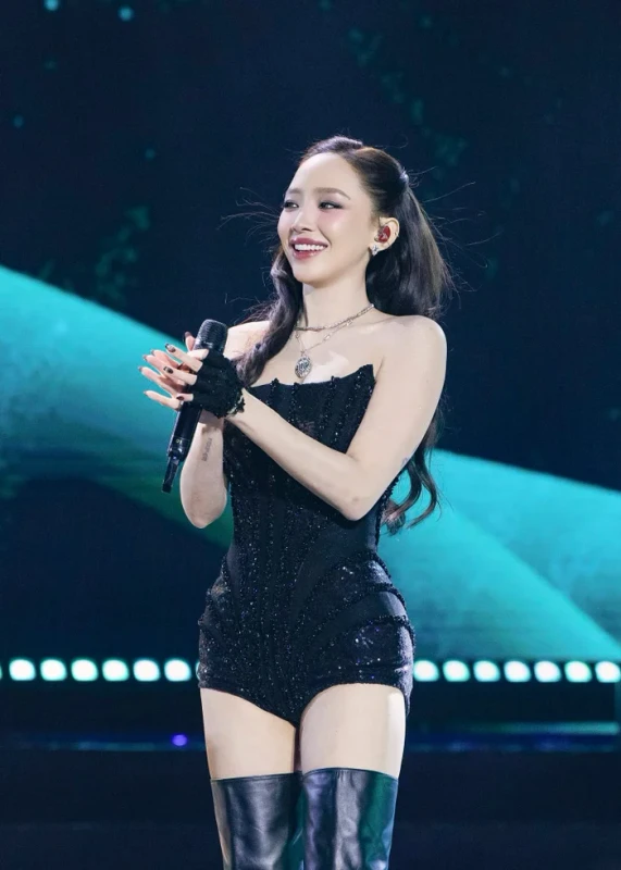 Tóc Tiên khoe trọn lợi thế hình thể trong thiết kế bodysuit đen ánh kim ôm sát, phom cúp ngực không dây giúp tôn bờ vai và đường cong khỏe khoắn. Chất liệu đính kết lấp lánh bắt sáng theo từng chuyển động, kết hợp boots da cao quá gối tạo nên diện mạo sắc sảo, cuốn hút và giàu năng lượng biểu diễn. Ảnh: FBNV