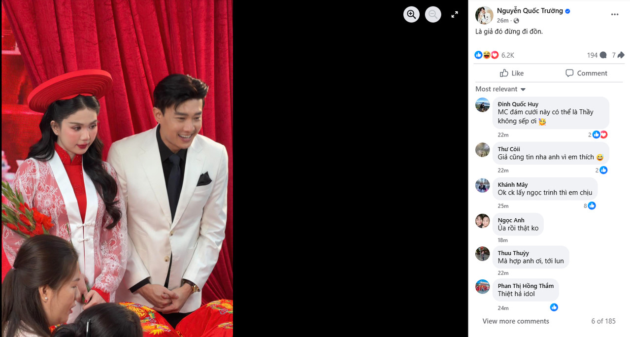 Mới đây, nam diễn viên Quốc Trường bất ngờ đăng hình ảnh chụp cùng Ngọc Trinh trong khi diện trang phục cưới đỏ rực, đứng cạnh nhau trong không gian lễ cưới truyền thống. Ngay lập tức, bức ảnh khiến cộng đồng mạng xôn xao. Dù nam diễn viên khẳng định “là giả đó”, cộng đồng mạng vẫn sôi sục với hàng loạt nghi vấn về mối quan hệ “thật – giả” của cặp đôi hot nhất Vbiz hiện nay.