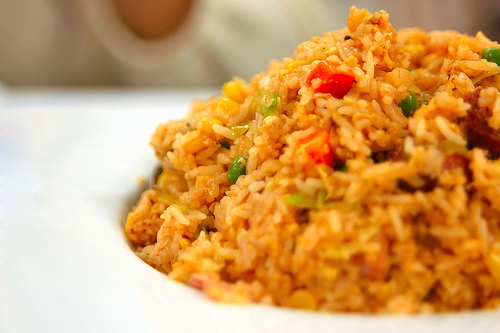 – Cho cơm vào trộn đều, nêm bột nêm, tiêu, ngũ vị hương, đảo cho hạt cơm săn lại.