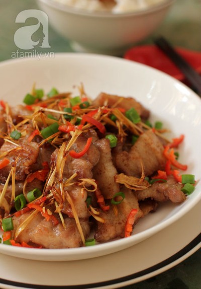 Tắt bếp, xúc thịt rang cháy cạnh ra đĩa. Rắc chút ớt và hành lá, dùng nóng.