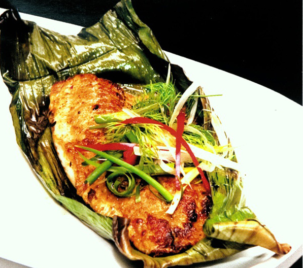 - Cá hồng lọc bỏ xương, ướp gia vị. Khoai môn gọt vỏ, hấp chín. Sau đó nghiền nát. Lá chuối rửa sạch, nướng qua lửa cho mềm. Gói miếng cá vào trong lá chuối và đem nướng chín. Bày tất cả ra đĩa, ăn cùng khoai môn nghiền.